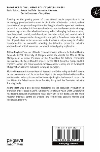 Focusing on the growing power of transnational media corporations in an increasingly globalized environment for distribution of television content, and on the effects of mergers and acquisitions involving local and independent television production companies, this book examines how current and recent re-structurings in ownership across the television industry reflect changing business models, how they affect creativity and diversity of television output, and to what extent they call for new approaches to regulation and policy. Based on a major study of the UK production sector as a case study, it offers a unique analysis of wider transformations in ownership affecting the television production industry worldwide and of their economic, socio-cultural and policy implications.