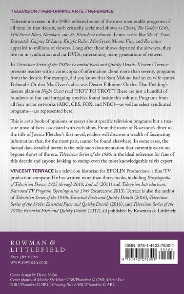 Television screens in the 1980s reflected some of the most memorable programs of all time. In that decade, such critically acclaimed shows as Cheers, The Golden Girls, Hill Street Blues, Newhart, and St. Elsewhere debuted. In that same decade, iconic shows like The A-Team, Baywatch, Cagney & Lacey, Knight Rider, MacGyver, Miami Vice, and Roseanne appealed to millions of viewers. Even after these shows departed the airwaves, they live on in syndication and on DVDs, entertaining many generations of viewers. In Television Series of the 1980s: Essential Facts and Quirky Details, Vincent Terrace presents readers with a cornucopia of information about more than seventy programs from the decade. For example, did you know that Sam Malone had an ex-wife named Deborah? Or that MacGyver's alias was Dexter Fillmore? Or Dan Fielding's license plate on Night Court read "Hot to Trot"? These are just a handful of hundreds of fun and intriguing specifics found inside this volume. Programs from all four major networks (ABC, CBS, FOX, and NBC)-as well as select syndicated programs-are represented here. This is not a book of opinions or essays about specific television programs but a treasure trove of facts associated with each show. From the name of Roseanne's diner to the title of Jessica Fletcher's first novel, readers will discover a wealth of fascinating information that, for the most part, cannot be found elsewhere. In some cases, the factual data detailed herein is the only such documentation that currently exists on bygone shows of the era. Television Series of the 1980s is the ideal reference for fans of this decade and anyone looking to stump even the most knowledgeable trivia expert.