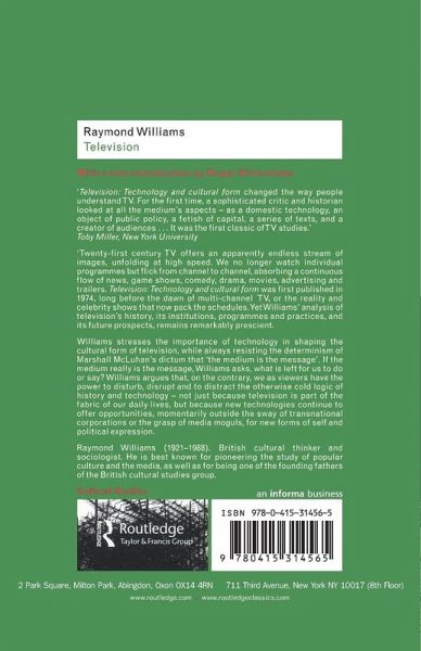 Television: Technology and Cultural Form was first published in 1974, long before the dawn of multi-channel TV, or the reality and celebrity shows that now pack the schedules. Yet Williams' analysis of television's history, its institutions, programmes and practices, and its future prospects, remains remarkably prescient.
