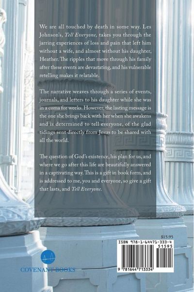 We are all touched by death in some way. Les Johnson's, Tell Everyone, takes you through the jarring experiences of loss and pain that left him without a wife, and almost without his daughter, Heather. The ripples that move through his family after these events are devastating, and his vulnerable retelling makes it relatable. The narrative weaves through a series of events, journals, and letters to his daughter while she was in a coma for weeks. However, the lasting message is the one she brings back with her when she awakens and is determined to tell everyone, of the glad tidings sent directly from Jesus to be shared with all the world. The question of God's existence, his plan for us, and where we go after this life are beautifully answered in a captivating way. This is a gift in book form, and is addressed to me, you and everyone, so give a gift that lasts, and Tell Everyone.