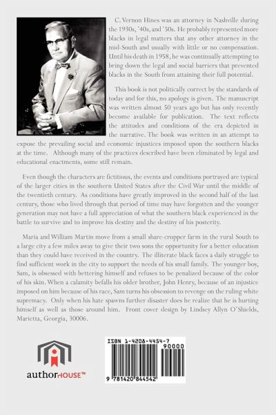 William Martin, an illiterate black share-cropper in the rural South and his wife, Maria, move from their small farm to a large southern city in the midst of the great financial depression to give their two sons the opportunity for a better education. They all face almost insurmountable obstacles to better themselves because of the segregation, discrimination, subjugation, and humiliation imposed by the ruling white supremacy. The younger son, Sam, is confronted with the daily challenge of either accepting his secondary life as a black or rising above his environment and being accepted as a person regardless of the color of his skin. The injustices inflicted upon him and his family breeds a hatred within him. How he handles this hatred determines his personal destiny.