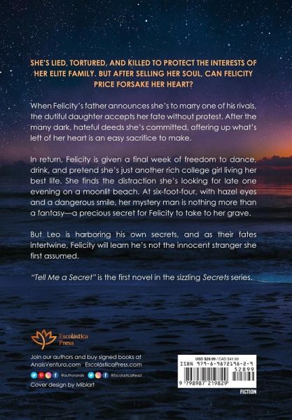 She's lied, tortured, and killed to protect the interests of her elite family. But after selling her soul, can Felicity Price forsake her heart? When Felicity's father announces she's to marry one of his rivals, the dutiful daughter accepts her fate without protest. After the many dark, hateful deeds she's committed, offering up what's left of her heart is an easy sacrifice to make. In return, Felicity is given a final week of freedom to dance, drink, and pretend she's just another rich college girl living her best life. She finds the distraction she's looking for late one evening on a moonlit beach. At six-foot-four, with hazel eyes and a dangerous smile, her mystery man is nothing more than a fantasy-a precious secret for Felicity to take to her grave. But Leo is harboring his own secrets, and as their fates intertwine Felicity will learn he's not the innocent stranger she first assumed. "Tell Me a Secret" is the first novel in the sizzling Secrets series. This book contains mature content, including references to alcohol and drug use, sexual themes, abuse, assault, blood, torture, and death.