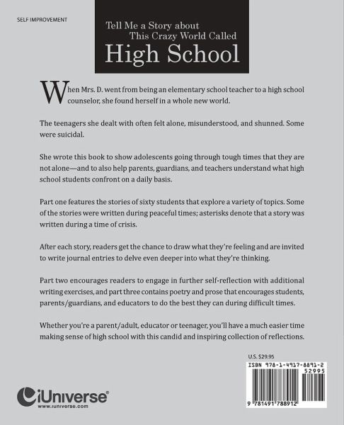 When Mrs. D. went from being an elementary school teacher to a high school counselor, she found herself in a whole new world. The teenagers she dealt with often felt alone, misunderstood, and shunned. Some were suicidal. She wrote this book to show adolescents going through tough times that they are not alone-and to also help parents, guardians, and teachers understand what high school students confront on a daily basis. Part one features the stories of sixty students that explore a variety of topics. Some of the stories were written during peaceful times; asterisks denote that a story was written during a time of crisis. After each story, readers get the chance to draw what they're feeling and are invited to write journal entries to delve even deeper into what they're thinking. Part two encourages readers to engage in further self-reflection with additional writing exercises, and part three contains poetry and prose that encourages students, parents/guardians, and educators to do the best they can during difficult times. Whether you're a parent/adult, educator or teenager, you'll have a much easier time making sense of high school with this candid and inspiring collection of reflections.