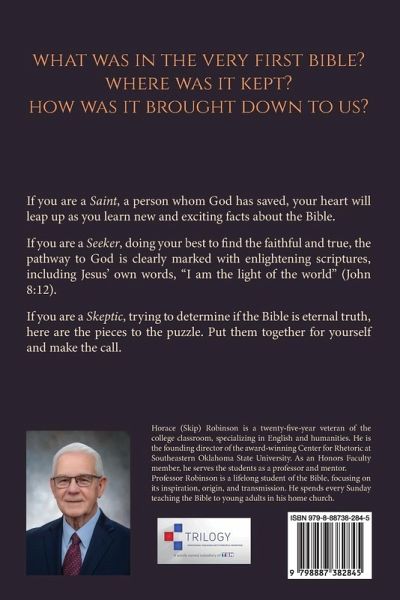 If you are a Saint, a person whom God has saved, your heart will leap up as you learn new and exciting facts about the Bible. If you are a Seeker, doing your best to find the faithful and true, the pathway to God is clearly marked with enlightening scriptures, including Jesus' own words, "I am the light of the world" (John 8:12). If you are a Skeptic, trying to determine if the Bible is eternal truth, here are the pieces to the puzzle. Put them together for yourself and make the call.