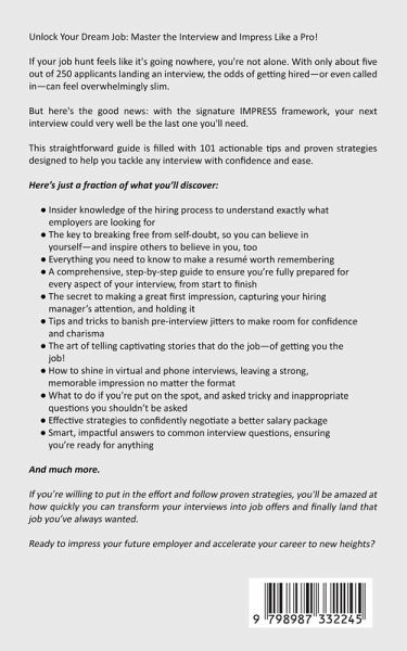 Unlock Your Dream Job: Master the Interview and Impress Like a Pro! If your job hunt feels like it's going nowhere, you're not alone. With only about five out of 250 applicants landing an interview, the odds of getting hired-or even called in-can feel overwhelmingly slim. But here's the good news: with the signature IMPRESS framework, your next interview could very well be the last one you'll need. This straightforward guide is filled with 101 actionable tips and proven strategies designed to help you tackle any interview with confidence and ease. Here's just a fraction of what you'll discover: Insider knowledge of the hiring process to understand exactly what employers are looking for The key to breaking free from self-doubt, so you can believe in yourself-and inspire others to believe in you, too Everything you need to know to make a resumé worth remembering A comprehensive, step-by-step guide to ensure you're fully prepared for every aspect of your interview, from start to finish The secret to making a great first impression, capturing your hiring manager's attention, and holding it Tips and tricks to banish pre-interview jitters to make room for confidence and charisma The art of telling captivating stories that do the job-of getting you the job! How to shine in virtual and phone interviews, leaving a strong, memorable impression no matter the format What to do if you're put on the spot, and asked tricky and inappropriate questions you shouldn't be asked Effective strategies to confidently negotiate a better salary package Smart, impactful answers to common interview questions, ensuring you're ready for anything And much more. If you're willing to put in the effort and follow proven strategies, you'll be amazed at how quickly you can transform your interviews into job offers and finally land that job you've always wanted.Ready to impress your future employer and accelerate your career to new heights?