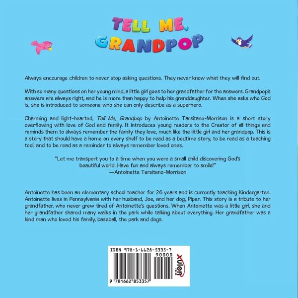 Always encourage children to never stop asking questions. They never know what they will find out. With so many questions on her young mind, a little girl goes to her grandfather for the answers. Grandpopís answers are always right, and he is more than happy to help his granddaughter. When she asks who God is, she is introduced to someone who she can only describe as a superhero. Charming and light-hearted, Tell Me, Grandpop by Antoinette Tarsitano-Morrison is a short story overflowing with love of God and family. It introduces young readers to the Creator of all things and reminds them to always remember the family they love, much like the little girl and her grandpop. This is a story that should have a home on every shelf to be read as a bedtime story, to be read as a teaching tool, and to be read as a reminder to always remember loved ones. ìLet me transport you to a time when you were a small child discovering Godís beautiful world. Have fun and always remember to smile!î -óAntoinette Tarsitano-Morrison Antoinette has been an elementary school teacher for 26 years and is currently teaching Kindergarten. Antoinette lives in Pennsylvania with her husband, Joe, and her dog, Piper. This story is a tribute to her grandfather, who never grew tired of Antoinetteís questions. When Antoinette was a little girl, she and her grandfather shared many walks in the park while talking about everything. Her grandfather was a kind man who loved his family, baseball, the park and dogs.