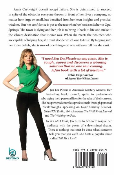 Anna Cartwright doesn't accept failure. She is determined to succeed in spite of the obstacles everyone throws in front of her. Every company, no matter how large or small, has benefited from her keen insights and practical wisdom. But her confidence is put to the test when her boss sends her to Opal Springs. The town is dying and her job is to bring it back to life and make it the vibrant destination that it once was. When she meets the two men who are capable of helping her, she must decide which one to trust. By tapping into her inner beliefs, she is sure of one thing-no one will ever tell her she can't. "I need Jen Du Plessis on my team. She is tough, savvy and discovers a winning solution that no one saw coming. A fun book with a lot of wisdom." Robin Edgar author of Beyond Your Wildest Dreams