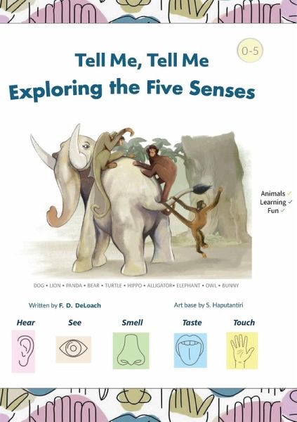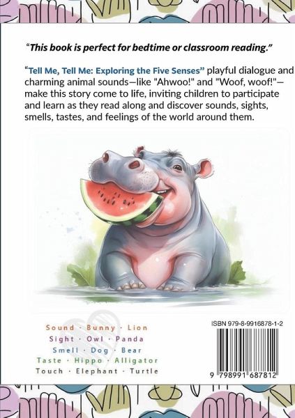 Perfect for bedtime or classroom reading "Tell Me, Tell Me: Exploring the Five Senses" is a delightful rhyming adventure that takes children on a sensory journey through the animal kingdom. With lovable characters like Quiet Bunny, Watchful Owl, and Happy Dog, kids are invited to discover the sounds, sights, smells, tastes, and feelings of the world around them. From the howls of a nearby wolf to the sweet scent of honey in the wilderness, each page encourages young readers to engage their five senses in a fun and interactive way. The playful dialogue and charming animal sounds-like "Ahwoo!" and "Woof, woof!"-make this story come to life, inviting children to participate as they read along. By the end, children are inspired to use their own senses, just like their favorite animal friends, to explore the world around them. Perfect for young readers, this heartwarming book promotes curiosity, sensory awareness, and a love for nature! Ideal for ages 0-5, this is a must-have for parents and educators looking to spark a child's imagination and sense of wonder.