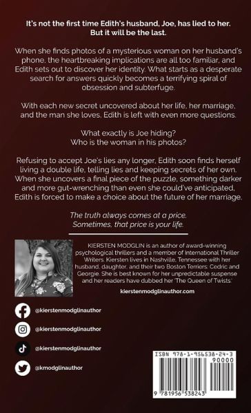 It's not the first time Edith's husband, Joe, has lied to her. But it will be the last. When she finds photos of a mysterious woman on her husband's phone, the heartbreaking implications are all too familiar, and Edith sets out to discover her identity. What starts as a desperate search for answers quickly becomes a terrifying spiral of obsession and subterfuge. With each new secret uncovered about her life, her marriage, and the man she loves, Edith is left with even more questions. What exactly is Joe hiding? Who is the woman in his photos? Refusing to accept Joe's lies any longer, Edith soon finds herself living a double life, telling lies and keeping secrets of her own. When she uncovers a final piece of the puzzle, something darker and more gut-wrenching than even she could've anticipated, Edith is forced to make a choice about the future of her marriage. The truth always comes at a price. Sometimes, that price is your life.