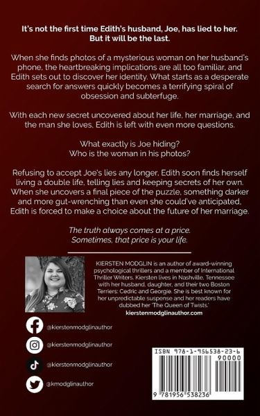 It's not the first time Edith's husband, Joe, has lied to her. But it will be the last. When she finds photos of a mysterious woman on her husband's phone, the heartbreaking implications are all too familiar, and Edith sets out to discover her identity. What starts as a desperate search for answers quickly becomes a terrifying spiral of obsession and subterfuge. With each new secret uncovered about her life, her marriage, and the man she loves, Edith is left with even more questions. What exactly is Joe hiding? Who is the woman in his photos? Refusing to accept Joe's lies any longer, Edith soon finds herself living a double life, telling lies and keeping secrets of her own. When she uncovers a final piece of the puzzle, something darker and more gut-wrenching than even she could've anticipated, Edith is forced to make a choice about the future of her marriage. The truth always comes at a price. Sometimes, that price is your life.