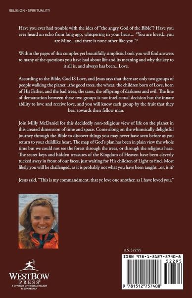 Have you ever had trouble with the idea of "the angry God of the Bible"? Have you ever heard an echo from long ago, whispering in your heart... "You are loved...you are Mine...and there is none other like you."? Within the pages of this complex yet beautifully simplistic book you will find answers to many of the questions you have had about life and its meaning and why the key to it all is, and always has been...Love. According to the Bible, God IS Love, and Jesus says that there are only two groups of people walking the planet...the good trees, the wheat, the children born of Love, born of His Father, and the bad trees, the tares, the offspring of darkness and evil. The line of demarcation between these two groups is not intellectual decision but the innate ability to love and receive love, and you will know each group by the fruit that they bear towards their fellow man. Join Milly McDaniel for this decidedly non-religious view of life on the planet in this created dimension of time and space. Come along on the whimsically delightful journey through the Bible to discover things you may never have seen before as you return to your childlike heart. The map of God's plan has been in plain view the whole time but we could not see the forest through the trees, or through the religious haze. The secret keys and hidden treasures of the Kingdom of Heaven have been cleverly tucked away in front of our faces, just waiting for His children of Light to find. Most likely you will be challenged, as it is probably not what you have been taught...or, is it? Jesus said, "This is my commandment, that ye love one another, as I have loved you."