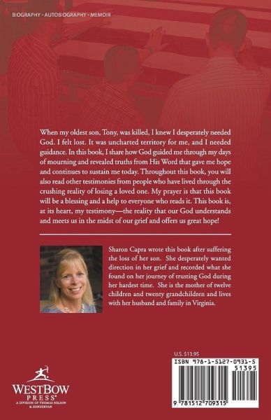 When my oldest son, Tony, was killed, I knew I desperately needed God. I felt lost. It was uncharted territory for me, and I needed guidance. In this book, I share how God guided me through my days of mourning and revealed truths from His Word that gave me hope and continues to sustain me today. Throughout this book, you will also read other testimonies from people who have lived through the crushing reality of losing a loved one. My prayer is that this book will be a blessing and a help to everyone who reads it. This book is, at its heart, my testimony-the reality that our God understands and meets us in the midst of our grief and offers us great hope!