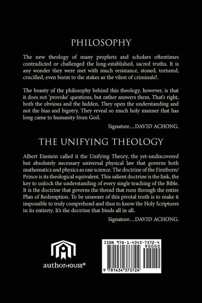 PHILOSOPHY The new theology of many prophets and scholars oftentimes contradicted or challenged the long-established, sacred truths. It is any wonder they were met with much resistance, stoned, tortured, crucified, even burnt to the stakes as the vilest of criminals?. The beauty of the philosophy behind this theology, however, is that it does not 'provoke' questions, but rather answers them. That's right, both the obvious and the hidden. They open the understanding and not the bias and bigotry. They reveal so much holy manner that has long came to humanity from God. Signature...DAVID ACHONG. THE UNIFYING THEOLOGY Albert Einstein called it the Unifying Theory, the yet-undiscovered but absolutely necessary universal physical law that governs both mathematics and physics as one science. The doctrine of the Firstborn/Prince is its theological equivalent. This salient doctrine is the link, the key to unlock the understanding of every single teaching of the Bible. It is the doctrine that governs the thread that runs through the entire Plan of Redemption. To be unaware of this pivotal truth is to make it impossible to truly comprehend and thus to know the Holy Scriptures in its entirety. It's the doctrine that binds all in all. Signature...DAVID ACHONG.