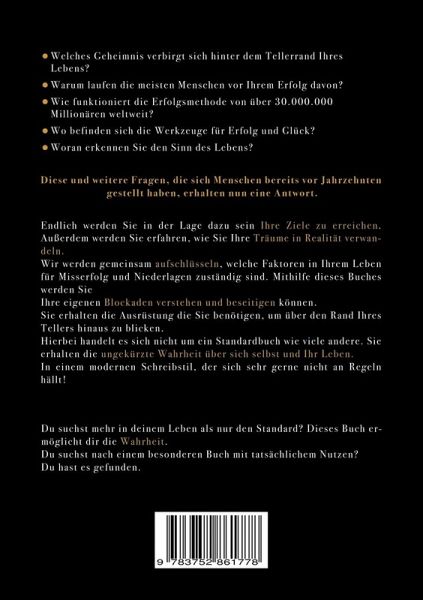 Welches Geheimnis verbirgt sich hinter dem Tellerrand Ihres Lebens?Warum laufen die meisten Menschen vor Ihrem Erfolg davon?Wie funktioniert die Erfolgsmethode von über 30.000.000 Millionären weltweit?Wo befinden sich die Werkzeuge für Erfolg und Glück?Woran erkennen Sie den Sinn des Lebens?Diese und weitere Fragen, die sich Menschen bereits vor Jahrhunderten gestellt haben, erhalten nun eine Antwort.Endlich werden Sie in der Lage dazu sein Ihre Ziele zu erreichen.Außerdem werden Sie erfahren, wie Sie Ihre Träume in Realität verwandeln. Gemeinsam werden wir aufschlüsseln, welche Faktoren in Ihrem Leben für Misserfolg und Niederlagen zuständig sind.Mithilfe dieses Buches werden Sie Ihre eigenen Blockaden verstehen und beseitigen können. Sie erhalten die Ausrüstung die Sie benötigen, um über den Rand Ihres Tellers hinaus zu blicken.Hierbei handelt es sich nicht um ein Standardbuch wie viele andere. Sie erhalten die ungekürzte Wahrheit über sich selbst und Ihr Leben.In einem modernen Schreibstil, der sich sehr gerne nicht an Regeln hält.Du suchst mehr in deinem Leben als nur Standard? Dieses Buch ermöglicht dir die Wahrheit.Du suchst nach einem besonderen Buch mit tatsächlichem Nutzen? Du hast es gefunden.Leserbewertungen:,, Unfassbar, wie unglaublich einfach ich das in meinem Leben anwenden kann!" Miriam M.,, Seit längerer Zeit das beste Buch über Selbstmotivation, dass ich gelesen habe." Sebastian H.,,Ich wünschte ich hätte dieses Buch früher gelesen!" Jakob B.,,Der Schreibstil ist tatsächlich besonders, dass was man lernt sogar einzigartig." Felix K.,,Ich bin dankbar dafür, dass Ich dieses Buch von meiner Frau geschenkt bekommen habe" Manuel S.,, So etwas habe Ich noch nie gelesen!" Anne M.