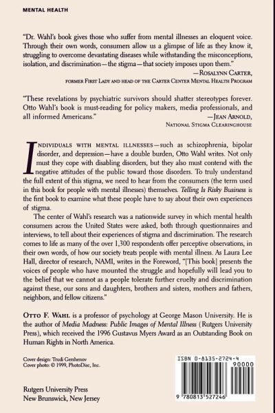 Individuals with a mental illnesses-such as schizophrenia, bipolar disorder, and depression-have a double burden, Otto Wahl writes. Not only must they cope with disabling disorders, but they also must contend with the negative attitudes of the public toward those disorders. To truly understand the full extent of this stigma, we need to hear from the consumers (the term used in this book for people with mental illness) themselves. Telling is Risky Business is the first book to examine what these people have to say about their own experiences of stigma. The center of Wahl’s research was a nationwide survey in which mental health consumers across the United States were asked, both through questionnaires and interviews, to tell about their experiences of stigma and discrimination. The research comes to life as many of the over 1,300 respondents’ acute observations are reported directly, in their own words. Telling is Risky Business vividly covers topics such as isolation, rejection, discouragement, and discrimination. Consumers also offer perceptive observations of how our society depicts people with mental illness. The book ends with suggestions for strategies and coping; an invaluable section on resources available for fighting stigma guarantees its place on many bookshelves. As Laura Lee Hall writes, “This book will likely open your eyes to a topic that you probably did not understand.”
