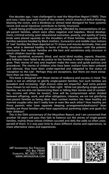 Five decades ago, I was challenged to read the Moynihan Report (1965). Then and now, I take issue with much of the content, which smacks of deficit thinking, blaming the victim, and a blindness or almost total disregard for how systemic racism and social injustices contribute to family structures. I recall being professionally and personally offended by interpretations of single-parent families, which were often negative and hopeless. Moral development, criminal activity, poor educational outcomes, poverty, and apathy of many kinds were placed squarely on the shoulders of these families, especially if the families were/are headed by Black mothers. Eurocentric and middle class notions of 'real' families like those depicted on TV shows and movies dominate, then and now, what is deemed healthy in terms of family structures - with the polemic conclusion that nuclear families are the best and sometimes only structure in which children must be raised. These colorblind, economic blind, and racist blind studies, reports, theories, and folktales have failed to do justice to the families in which there is one caregiver. Their stories of woe and mayhem make the news and guide policies and procedures. The stories of children who have been resilient have been unheard and silenced, they have been under-reported and relegated to the status of 'exception to the rule'. Perhaps they are exceptions, but there are more exceptions than we may know. This book is designed with those stories of resilience and success in mind. The book is not an attempt to glorify single-parent families, but such families are prevalent and increasing. High divorce rates are impactful. And some parents have chosen to not marry, which is their right. While not glorifying single-parent families, we are also not demonizing them or telling their stories void of context. Yes, income will often be low(er), time will be compromised when divided between offspring, work, and other obligations. Likewise, we are not glorifying two-parent families as being ideal; their context matters too. How healthy are married couples who don't really love or even like each other? How healthy are those parents who have separate sleeping arrangements/bedrooms? How healthy are those families who have oppositional parenting styles and goals for their children? This is the 50th anniversary of the Moynihan Report, and I am concerned that another 50 years will pass that fails to balance out the stories of single-parent families, mainly those whose children succeed and defy the odds so often unexpected of them. I agree with Cohen, co-author of the updated report: "The preoccupation with strengthening marriage as the best route to reducing poverty and inequality has been a policymaking folly". Further, 50 years after Moynihan released the controversial report, The Negro Family: The Case for National Action, a new brief by the Institute for Women's Policy Research (IWPR) and the Council on Contemporary Families (CCF) titled, "Moynihan's Half Century: Have We Gone to Hell in a Hand Basket?," finds that the changes in family structure that concerned him have indeed continued, becoming widespread among Whites as well, but that they do not explain recent trends in poverty and inequality. In fact, a number of the social ills Moynihan assumed would accompany these changes in family structure-such as rising rates of poverty, school failure, crime, and violence-have instead decreased. (see : http://www.streetinsider.com/Press+Releases/The+Moynihan+Report+at+50% 3A+New+Report+Finds+that+the+Rise+of+Single+Mothers+Does+Not+Explain+Poverty+Rates+Fully/10344482.html)