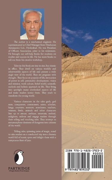 Tales in this book are tiny in size, but titanic in effect. They dwell on various worldly and otherworldly aspects of life and present a wide angle view of the world. They are pregnant with thought. They focus on purpose of life, invocation of power in self, personality development, vision and mission, work culture, belief world, scientific outlook and holistic approach in life. They bring into spotlight many overlooked aspects of life and make readers notice them. They teach to transform the young world. Various characters in the tales gods, god men, conquerors, commoners, saints, scholars, kings, courtiers, mentors, merchants, teachers, winners, birds, animals and other characters line up to amuse, enthuse, entertain, enthral, enlighten, enliven and engage readers through their telling and touching tales. They attempt to metamorphose denizens of dungeons into citizens of the world. Telling tales, spinning yarns of magic, stand to take readers on a conducted trip into a literary world full of scenic spots and delight them with a sumptuous feast of joys.