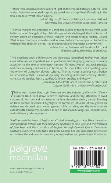 "This excellent book is informative, and rigorously researched. Telling West Indian Lives addresses an important gap in plantation historiography, namely, scholarly attention to the role of nineteenth century life narratives of enslaved peoples, and their meanings particularly in terms of Christian influences impacting upon the reform of plantation slavery cultures. Sue Thomas makes a serious contribution to scholarship that is cross-disciplinary including nineteenth century studies, transatlantic studies, literary studies, Caribbean studies, and History." - Joan Anim-Addo, Professor of Caribbean Literature and Culture, Goldsmiths, University of London, UK