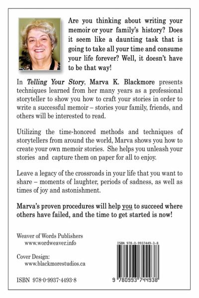 Are you thinking about writing your memoir or your family's history? Does it seem like a daunting task? Well, it doesn't have to be.In Telling Your Story, Marva K. Blackmore presents techniques learned from her many years as a professional storyteller to show you how to craft your stories and write a successful memoir -- stories your family, friends, and others will find interesting to read. Utilizing the time-honored methods and techniques of storytellers around the world, Marva shows you how to create your own memoir stories and helps you unleash your stories and capture them in writing for all to enjoy. Leave a legacy of the crossroads in your life that you want to share -- moments of laughter, periods of sadness, as well times of joy and astonishment. Marva's proven techniques will help you to succeed where others have failed, and the time to get started is now!