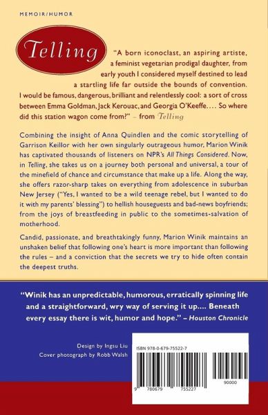 Combining the insight of Anna Quindlen and the comic storytelling of Garrison Keillor with her own singularly outrageous humor, Marion Winik has captivated thousands of listeners on NPR's All Things Considered. Now, in Telling, she takes us on a journey both personal and universal, a tour of the minefield of chance and circumstance that make up a life. Along the way, she offers razor-sharp takes on everything from adolescence in suburban New Jersey ("Yes, I wanted to be a wild teenage rebel, but I wanted to do it with my parents' blessing") to hellish houseguests and bad-news boyfriends; from the joys of breastfeeding in public to the sometimes-salvation of motherhood. Candid, passionate, and breathtakingly funny, Marion Winik maintains an unshaken belief that following one's heart is more important than following the rules -- and a conviction that the secrets we try to hide often contain the deepest truths. "A born iconoclast, an aspiring artiste, a feminist vegetarian prodigal daughter, from early youth I considered myself destined to lead a startling life far outside the bounds of convention. I would be famous, dangerous, brilliant and relentlessly cool: a sort of cross between Emma Goldman, Jack Kerouac, and Georgia O'Keeffe.... So where did this station wagon come from?" -- from Telling