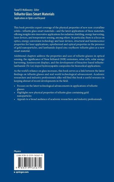 Preface.- 1 New Tellurite Glasses.- 2 Shielding Properties of Tellurite Glasses.- 3 Tellurite Glass Materials for Energy Conversion Technology and Laser Devices.- 4 Structural and Luminescence Properties of Tellurite Glasses for Laser Applications.- 5 Optothermal Properties of Vanadate-Tellurate Oxide Glasses and Some Suggested Applications.- 6 Optical Properties of Sm3+ Doped Sodium-Tellurite Glasses in the Presence of Gold Nanoparticles.- 7 Lanthanide Doped Zinc-Fluorotellurite Glasses.- 8 Optical Sensing Based on Rare-Earth Doped Tellurite Glasses.- 9 Lanthanide Doped Tellurite Glasses for Solar Energy Harvesting.- 10 Tellurite Glasses for Solar Cells Applications.- 11 Development of Bioactive Based Tellurite-Lanthide (Te-Ln) doped Hydroxyapatite Composites for Biomedical Applications.- Index.
