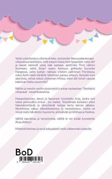 Voiko uskottomuus olla hyvä teko, onnistuiko Veera pakenemaan villasukissa teloittajia, mitä anopin liukas kieli lipsautteli, miksi äiti ja lapset menivät salaa isää vastaan, ajettiinko Pirre väkisin Suomeen, veikö Ilmari aseen kouluun, golfasiko luuranko Hangossa, saiko Lydian rakkaus vihdoin palkinnon Floridassa, miksi Antti käski käräjillä Vänttisen painua vittuun, löytyikö onni abortista, minne katosi pikkuinen Minna, miksi äiti toivoi vauvan kakkivan Kallen puserolle? Näihin ja moniin muihin kysymyksiin antaa vastauksen 'Teloitetut villasukat' -novellikokoelma. Helppolukuinen, kevyt ja hauskasti kirjoitettu kirja, jonka voit lukea pienissäkin erissä - jos maltat. Tosielämän kohtalon oikut hämmästyttävät ja järkyttävät lukijaa kerta kerran jälkeen. Novelleissa näkyy elämänkokemus ja monialaisuus, mutta on niissä myös häivähdys huumoria, arkipäivän juridiikkaa ja Hankoa. Välillä naurattaa ja hymyilyttää, välillä ei voi estää kyyneleitä. Aina yllättyy! Mielenkiintoinen ja hyvä lukupaketti myös vähemmän lukeville.