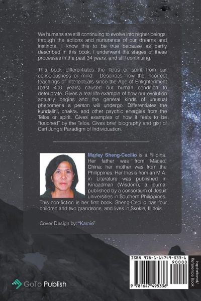 We, humans, are still continuing to evolve into higher beings, through the actions and nurturance of our dreams and instincts. I know this to be true because as partly described in this book, I underwent the stages of these processes in the past 34 years, and still continuing. This book differentiates the Telosmor spirit from our consciousness or mind. Describes how the incorrect teachings of intellectuals since the Age of Englightenment (past 400 years) caused our human condition to deteriorate. Gives a real-life example of how our evolution actually begins and the general kinds of unusual phenomena a person will undergo. Differentiates the kundalini, chakra, and other psychic energies from the Telos or spirit. Gives examples of how it feels to be "touched" by the Telos. Gives brief biography and gist of Carl Jung's Paradigm of Individuation.