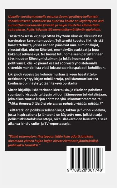 Uudelle vuosikymmenelle astunut Suomi pysähtyy helluntain shokkiuutiseen: telttailevista nuorista kolme on löydetty raa'asti surmattuina kesäiseltä järveltä ja neljäs taistelee elämästään sairaalassa. Poliisi käynnistää ennennäkemättömän ajojahdin. Tässä teoksessa kirjailija ottaa käyttöön rikoskirjallisuudessamme harvinaisen kerrontamuodon. Telttaretki koostuu fiktiivisistä haastatteluista, joissa ääneen pääsevät mm. silminnäkijät, rikostutkijat, uhrien läheiset, murhakylän asukkaat ja jopa kokenut selvänäkijä. Ne luovat tutunomaiseen perustarinaan täysin uuden lähestymiskulman, ja lukija huomaa pian pohtivansa, olisiko pienet osaset sopivasti yhdistelemällä sittenkin mahdollista vielä loksauttaa rikospalapeli kohdilleen. Liki puoli vuosisataa kolmoismurhan jälkeen haastattelu-urakkaan ryhtyy kirjan minäkertoja, poliisiammattikorkeakoulussa opinnäytetyötään tekevä opiskelija. Sitten kirjailija lisää tarinaan kierroksia, ja rikoksen pohdinta suuntaa julkisuudelta täysin piiloon jääneeseen tutkintalinjaan, joka alkaa tuntua kirjan edetessä yhä uskomattomammalta: "Miksi ihmeessä tästä ei ole ennen puhuttu yhtään mitään?" Telttaretki on poikkeuksellinen kirja, faktan ja fiktion kudelma, jossa inspiraationa ja lähteenä on käytetty mm. julkistettuja poliisitutkintadokumentteja, oikeuslääkäreiden lausuntoja sekä aikansa lehti-, radio- ja TV-reportaaseja. "Tämä uskomaton rikostapaus ikään kuin odotti jotakuta nivomaan yhteen hujan hajan olevat elementit jännittäväksi, jouhevaksi tarinaksi." Tämän kirjan innoittajina ovat olleet Andrea Maria Schenkelin rikosromaani "Hiljainen kylä" (Deutscher Krimi Preis 2007 -voittaja "Tannöd") ja yleisradiokanava ZDF:n tv-elokuva "Der Fall - Hinterkaifeck - Die wahre Geschichte hinter Tannöd", joka on katsottavissa mm. YouTube-videopalvelussa ja jossa müncheniläisen poliisikorkeakoulun oppilaat ryhtyvät läpikäymään kirjassa kuvattua 80 vuotta vanhaa ratkaisematonta kuuden ihmisen murhaa.