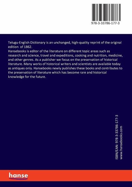 Telugu-English Dictionary is an unchanged, high-quality reprint of the original edition of 1862. Hansebooks is editor of the literature on different topic areas such as research and science, travel and expeditions, cooking and nutrition, medicine, and other genres. As a publisher we focus on the preservation of historical literature. Many works of historical writers and scientists are available today as antiques only. Hansebooks newly publishes these books and contributes to the preservation of literature which has become rare and historical knowledge for the future.