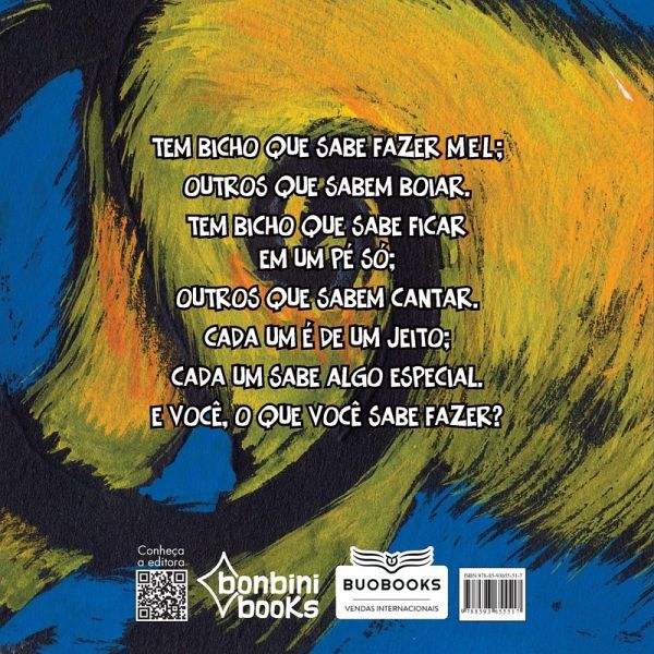 Todo mundo sempre tem algo que sabe fazer bem, não é mesmo? Com bicho, não é diferente. A abelha sabe fazer mel e o galo sabe cantar. O que será que a lontra, o camaleão e o panda fazem muito bem? Neste livro bem colorido, o bebê e a criança pequena vão se divertir em descobrir tudo aquilo que os bichos sabem fazer. No canal do Youtube da Editora Bamboozinho, a editora parceira da Bon Bini Books no Brasil, o leitor pode assistir a uma divertida animação mostra cada um dos bichos mostrados neste livro, complementando as imagens do livro ao ritmo de umatrilha sonora exclusiva. Este livro recebeu o selo Aqui tem natureza, que indica que a obra valoriza o nosso orgulho e sentimento de pertencimento à natureza. Ele tem a função de nos apresentar e admirar as riquezas naturais do nosso planeta e, também, conscientizar ainda mais o leitor para a necessidade de proteger a cada bichinho que aqui vive e o seu habitat, as praças, bosques, matas e florestas do mundo todo. Sinta o ar puro, ouça o som dos animais e se encante com a diversidade de cores, cheiros e formas que a natureza tem para mostrar. A Bamboozinho traz tudo isso para você na forma de livro infantil, cuidadosamente elaborado para que as crianças se percebam como parte de algo maior e cresçam com o sentimento de respeito e cuidado em relação ao ambiente!Conheça também os demais livros da Coleção Tem Bicho Que: Tem bicho que é, Tem bicho que gosta e Tem bicho que tem.Este livro é editado e comercializado no Brasil pela Editora Bamboozinho e internacionalmente pelo selo Bon Bini Books. Para vendas fora do Brasil, consulte o nosso site: www.bamboozinho.com.br.