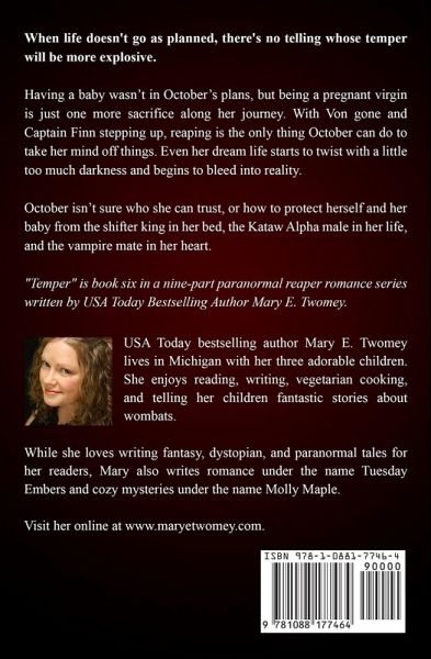 When life doesn't go as planned, there's no telling whose temper will be more explosive. Having a baby wasn't in October's plans, but being a pregnant virgin is just one more sacrifice along her journey. With Von gone and Captain Finn stepping up, reaping is the only thing October can do to take her mind off things. Even her dream life starts to twist with a little too much darkness and begins to bleed into reality. October isn't sure who she can trust, or how to protect herself and her baby from the shifter king in her bed, the Kataw Alpha male in her life, and the vampire mate in her heart. If you love Bella Forrest, Cassandra Clare, and falling in love with the bad boy, you'll devour the "Terraway" series by Mary E. Twomey. This is book six in the 9-part paranormal reaper romance series written by USA Today Bestselling Author Mary E. Twomey.