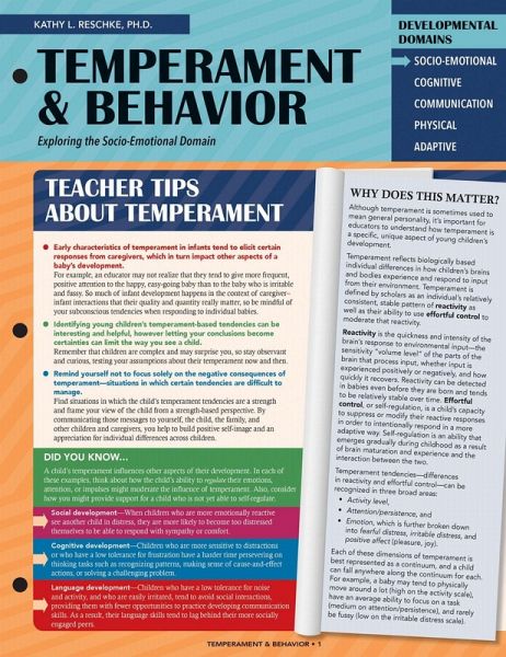 Part of the Quick Reference Guides for Early Childhood Best Practices, this convenient pack of 5 laminated, six-page primers gives early childhood educators practical guidance on how temperament affects early development—and how teachers should consider temperament when caring for and teaching children. Colorful graphics, lists, and tips instantly engage teachers and give them an at-a-glance understanding of: * expressions of temperament and how they develop over time * the impact of temperament on social, cognitive, and language development * ways to provide a “good fit” for the wide range of temperaments in a classroom * myths and facts about shyness * strategies for supporting emerging self-regulation, regardless of children’s temperament These developmentally appropriate practices are ready to use with children from birth to five across settings: in homes, classrooms, or professional learning environments. Also available as an individual guide! About the Quick Reference Guides for Early Childhood Best Practices Perfect for professional learning, these 16 Quick Reference Guides will put practical knowledge and ready-to-use strategies in the hands of every educator in your early childhood program. Developed by an early childhood expert with more than 40 years of experience in the field, these laminated, six-page primers cover specific topics with explicit links to core developmental domains: cognitive, physical, socio-emotional, communication, and adaptive. Teachers of children from birth to five will get tips they can trust on developmentally appropriate practices—not only within developmental domains, but in other key areas with a broad effect on a child’s life (such as mealtime, friendships, and creativity). Explore all the Quick Reference Guides here!