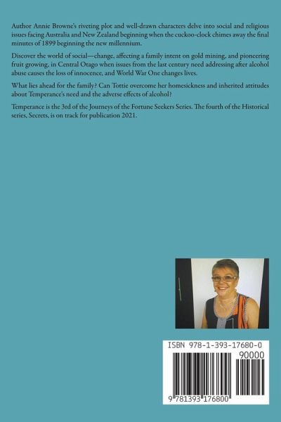 Author Annie Browne's riveting plot and well-drawn characters delve into social and religious issues facing Australia and New Zealand beginning when the cuckoo-clock chimes away the final minutes of 1899 beginning the new millennium. Discover the world of social-change, affecting a family intent on gold mining, and pioneering fruit growing, in Central Otago when issues from the last century need addressing after alcohol abuse causes the loss of innocence, and World War One changes lives. What lies ahead for the family? Can Tottie overcome her homesickness and inherited attitudes about Temperance's need and the adverse effects of alcohol? Temperance is the 3rd of the Journeys of the Fortune Seekers Series. The next of the Historical series, Secrets, is on track for publication 2022.