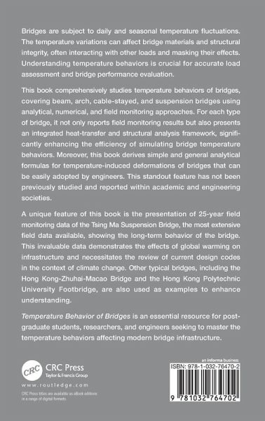 1. Introduction. 2. Structural Health Monitoring of Bridges. 3. Numerical Analysis of Bridge Temperature Behaviors. 4. Temperature Behaviors of Suspension Bridges. 5. Temperature Behaviors of Cable-stayed Bridges. 6. Temperature Behaviors of Arch Bridges. 7. Temperature Behaviors of Beam Bridges. 8. Long-term Temperature Behaviors of the Tsing Ma Bridge. 9. Temperature Effects on Vibrational Properties of Bridges. 10. Epilogue: Conclusions and Challenges.