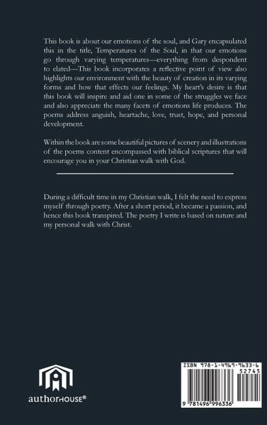 This book is about our emotions of the soul, and Gary encapsulated this in the title, Temperatures of the Soul, in that our emotions go through varying temperatures-everything from despondent to elated-This book incorporates a reflective point of view also highlights our environment with the beauty of creation in its varying forms and how that effects our feelings. My heart's desire is that this book will inspire and aid one in some of the struggles we face and also appreciate the many facets of emotions life produces. The poems address anguish, heartache, love, trust, hope, and personal development. Within the book are some beautiful pictures of scenery and illustrations of the poems content encompassed with biblical scriptures that will encourage you in your Christian walk with God.