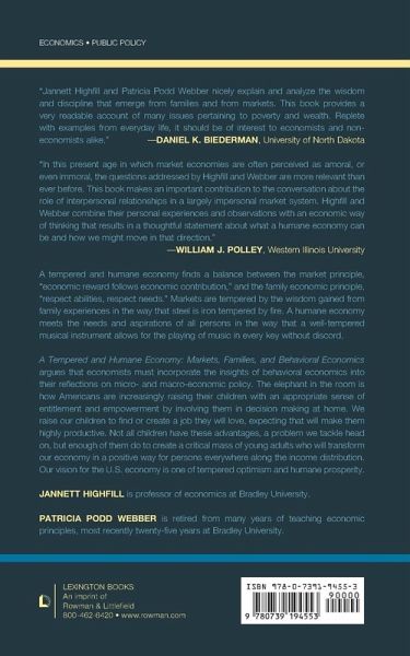 A tempered and humane economy finds a balance between the market principle, "economic reward follows economic contribution," and the family economic principle, "respect abilities, respect needs." Markets are tempered by the wisdom gained from family experiences in the way that steel is iron tempered by fire. A humane economy meets the needs and aspirations of all persons in the way that a well-tempered musical instrument allows for the playing of music in every key without discord. A Tempered and Humane Economy: Markets, Families, and Behavioral Economicsargues that economists must incorporate the insights of behavioral economics into their reflections on micro- and macro-economic policy. The elephant in the room is how Americans are increasingly raising their children with an appropriate sense of entitlement and empowerment by involving them in decision making at home. We raise our children to find or create a job they will love, expecting that will make them highly productive. Not all children have these advantages, a problem we tackle head on, but enough of them do to create a critical mass of young adults who will transform our economy in a positive way for persons everywhere along the income distribution. Our vision for the U.S. Economy is one of tempered optimism and humane prosperity.