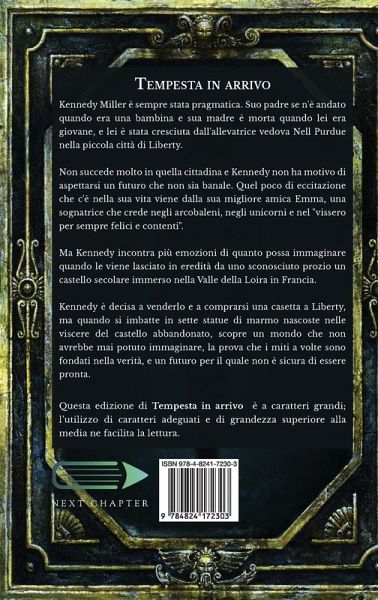 Kennedy Miller è sempre stata pragmatica. Suo padre se n'è andato quando era una bambina e sua madre è morta quando lei era giovane, e lei è stata cresciuta dall'allevatrice vedova Nell Purdue nella piccola città di Liberty. Non succede molto in quella cittadina e Kennedy non ha motivo di aspettarsi un futuro che non sia banale. Quel poco di eccitazione che c'è nella sua vita viene dalla sua migliore amica Emma, una sognatrice che crede negli arcobaleni, negli unicorni e nel "vissero per sempre felici e contenti". Ma Kennedy incontra più emozioni di quanto possa immaginare quando le viene lasciato in eredità da uno sconosciuto prozio un castello secolare immerso nella Valle della Loira in Francia. Kennedy è decisa a venderlo e a comprarsi una casetta a Liberty, ma quando si imbatte in sette statue di marmo nascoste nelle viscere del castello abbandonato, scopre un mondo che non avrebbe mai potuto immaginare, la prova che i miti a volte sono fondati nella verità, e un futuro per il quale non è sicura di essere pronta. Questa edizione di Tempesta in arrivo è a caratteri grandi; l'utilizzo di caratteri adeguati e di grandezza superiore alla media ne facilita la lettura.