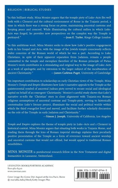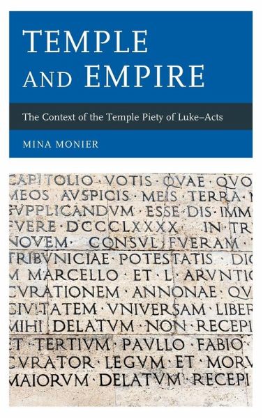 Mina Monier argues that Luke-Acts shared with 1 Clement a concern to define and defend a type of Christian piety that would not offend Roman sensibilities. The author used the Temple of Jerusalem positively, as a platform for showing Christian piety towards ancient worship, ancestral customs and God of antiquity.
