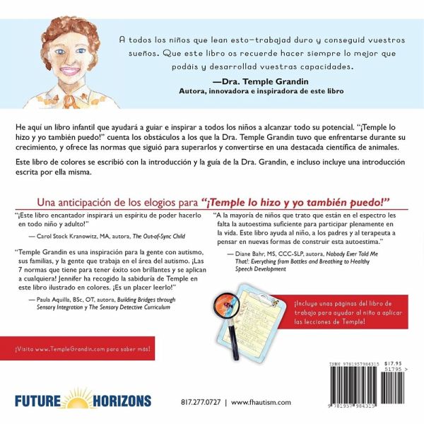 Este es un libro infantil que ayudara a guiar e inspirar a todos los ninos para que alcancen su potencial maximo. Temple Lo logro, y yo tambien puedo! explica los obstaculos que la Dra. Temple Grandin enfrento mientras crecia,luego da las reglas que ella siguio para superarlos y convertirse en una destacada cientifica de animales.