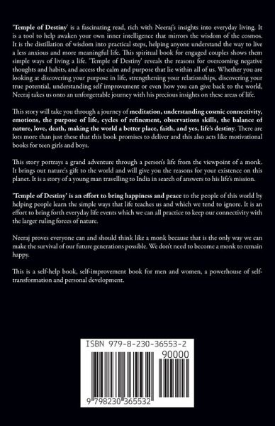 'Temple of Destiny' is a fascinating read, rich with Neeraj's insights into everyday living. It is a tool to help awaken your own inner intelligence that mirrors the wisdom of the cosmos. It is the distillation of wisdom into practical steps, helping anyone understand the way to live a less anxious and more meaningful life. This spiritual book for engaged couples shows them simple ways of living a life. 'Temple of Destiny' reveals the reasons for overcoming negative thoughts and habits, and access the calm and purpose that lie within all of us. Whether you are looking at discovering your purpose in life, strengthening your relationships, discovering your true potential, understanding self improvement or even how you can give back to the world, Neeraj takes us onto an unforgettable journey with his precious insights on these areas of life. This story will take you through a journey of meditation, understanding cosmic connectivity, emotions, the purpose of life, cycles of refinement, observations skills, the balance of nature, love, death, making the world a better place, faith, and yes, life's destiny. There are lots more than just these that this book promises to deliver and this also acts like motivational books for teen girls and boys. This story portrays a grand adventure through a person's life from the viewpoint of a monk. It brings out nature's gift to the world and will give you the reasons for your existence on this planet. It is a story of a young man travelling to India in search of answers to his life's mission. 'Temple of Destiny' is an effort to bring happiness and peace to the people of this world by helping people learn the simple ways that life teaches us and which we tend to ignore. It is an effort to bring forth everyday life events which we can all practice to keep our connectivity with the larger ruling forces of nature. Neeraj proves everyone can and should think like a monk because that is the only way we can make the survival of our future generations possible. We don't need to become a monk to remain happy. This is a self-help book, self-improvement book for men and women, a powerhouse of self-transformation and personal development.