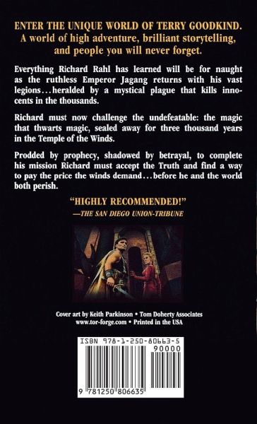 Terry Goodkind's bestselling epic fantasy series Sword of Truth continues with book four On the red moon will come the firestorm... Wielding the Sword of Truth, Richard Rahl has battled death itself and come to the defense of the D'Haran people. But now the power-mad Emperor Jagang confronts Richard with a swift and inexorable foe: a mystical plague cutting a deadly swath across the land and slaying thousands of innocent victims. To quench the inferno, he must seek remedy in the wind... To fight it Richard and his beloved Kahlan Amnell will risk everything to uncover the source of the terrible plague-the magic sealed away for three millennia in the Temple of the Winds. Lightning will find him on that path... But when prophecy throws the shadow of betrayal across their mission and threatens to destroy them, Richard must accept the Truth and find a way to pay the price the winds demand...or he and his world will perish.