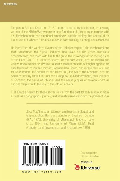Templeton Richard Drake, or "T. R." as he is called by his friends, is a young veteran of the Nibian War who returns to America and tries to come to grips with his disenchantment and emotional emptiness, and the feeling that control of his life is "out of his hands." He finds solace in hard drinking, painting, and casual sex. He learns that the wealthy inventor of the "blaster-trapper," the mechanical arm that transformed the flip ball industry, has taken his life under suspicious circumstances, and taken with him to the grave the knowledge of the resting place of the Holy Grail. T. R. joins the search for the holy vessel, and his dreams and visions reveal to him his destiny; to lead a modern crusade of knights against the dark forces of the Islamic terrorist, Assama ben Licken, and retake the Holy Land for Christendom. His search for the Holy Grail, the Ark of the Covenant, and the Spear of Destiny takes him from Mississippi to the Mediterranean, the Highlands of Scotland, the plains of Ethiopia, and the dense jungles of Mexico where an ancient temple holds the key to the fate of mankind. T. R. Drake's search for these sacred relics from the past takes him on a spiritual as well as a geographical journey, and ultimately reveals to him the power of love.