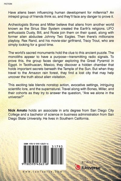 Have aliens been influencing human development for millennia? An intrepid group of friends think so, and they'll face any danger to prove it. Archeologists Bones and Miller believe that aliens from another world known as the Sirius Star System created the Earth's religions. UFO enthusiasts Dusty, Bill, and Roxie join them on their quest, along with former alien abductee Johnny Two Eagles. Then there's millionaire playboy, Rex Rand, and his movie-star girlfriend, Tracy Trout, who are simply looking for a good time. The world's sacred monuments hold the clue to this ancient puzzle. The monoliths appear to have a purpose-transmitting radio signals. To prove this, the group faces danger exploring the Great Pyramid in Egypt. In Teotihuacan, Mexico, they discover a hidden chamber that holds important secrets beneath the Temple of the Sun. But when they travel to the Amazon rain forest, they find a lost city that may help uncover the truth about alien visitation. This exciting tale blends nonstop action, evocative settings, intriguing scientific lore, and the supernatural. Travel along with Bones, Miller, and their cohorts as they try to answer the question, "Are we alone in the universe?"