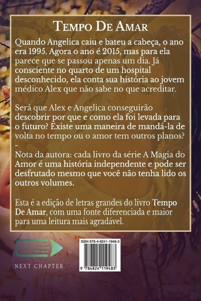 Quando Angelica caiu e bateu a cabeça, o ano era 1995. Agora o ano é 2015, mas para ela parece que se passou apenas um dia. Já consciente no quarto de um hospital desconhecido, ela conta sua história ao jovem médico Alex que não sabe no que acreditar. Será que Alex e Angelica conseguirão descobrir por que e como ela foi levada para o futuro? Existe uma maneira de mandá-la de volta no tempo ou o amor tem outros planos? Nota da autora: cada livro da série A Magia do Amor é uma história independente e pode ser desfrutado mesmo que você não tenha lido os outros volumes. Esta é a grande edição impressa de Tempo De Amar, com uma fonte / tipo de letra maior para facilitar a leitura.