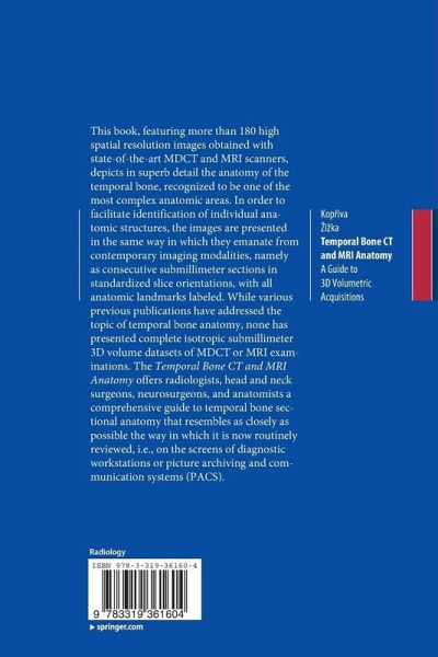 This book, featuring more than 180 high spatial resolution images obtained with state-of-the-art MDCT and MRI scanners, depicts in superb detail the anatomy of the temporal bone, recognized to be one of the most complex anatomic areas. In order to facilitate identification of individual anatomic structures, the images are presented in the same way in which they emanate from contemporary imaging modalities, namely as consecutive submillimeter sections in standardized slice orientations, with all anatomic landmarks labeled. While various previous publications have addressed the topic of temporal bone anatomy, none has presented complete isotropic submillimeter 3D volume datasets of MDCT or MRI examinations. The Temporal Bone MDCT and MRI Anatomy offers radiologists, head and neck surgeons, neurosurgeons, and anatomists a comprehensive guide to temporal bone sectional anatomy that resembles as closely as possible the way in which it is now routinely reviewed, i.e., on the screens ofdiagnostic workstations or picture archiving and communication systems (PACS).