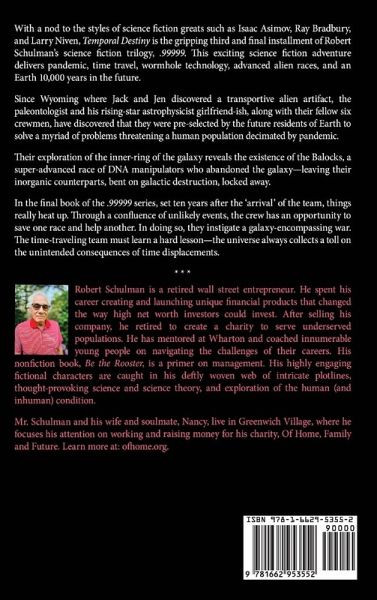 With a nod to the styles of science fiction greats such as Isaac Asimov, Ray Bradbury, and Larry Niven, Temporal Destiny is the gripping third and final installment of Robert Schulman's science fiction trilogy, .99999. This exciting science fiction adventure delivers pandemic, time travel, wormhole technology, an advanced alien race, and an Earth 10,000 years in the future. Since Wyoming where Jack and Jen discovered a transportive alien artifact, the paleontologist and his rising-star astrophysicist girlfriend-ish, along with their fellow six crewmen, have discovered that they were pre-selected by the future residents of Earth to solve a myriad of problems threatening a human population decimated by pandemic. Their exploration of the inner-ring of the galaxy reveals the existence of the Balocks, a super-advanced race of DNA manipulators who abandoned the galaxy-leaving inorganic beings bent on their destruction locked away behind them. In the final book of the .99999 series, set ten years after the 'arrival' of the team, things really heat up. Through a confluence of unlikely events, the crew has an opportunity to save one race and help another. In doing so, they instigate a galaxy-encompassing war. The time-traveling team must learn a hard lesson-the universe always collects a toll on the unintended consequences of time displacements.