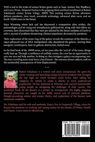 With a nod to the styles of science fiction greats such as Isaac Asimov, Ray Bradbury, and Larry Niven, Temporal Destiny is the gripping third and final installment of Robert Schulman's science fiction trilogy, .99999. This exciting science fiction adventure delivers pandemic, time travel, wormhole technology, an advanced alien race, and an Earth 10,000 years in the future. Since Wyoming where Jack and Jen discovered a transportive alien artifact, the paleontologist and his rising-star astrophysicist girlfriend-ish, along with their fellow six crewmen, have discovered that they were pre-selected by the future residents of Earth to solve a myriad of problems threatening a human population decimated by pandemic. Their exploration of the inner-ring of the galaxy reveals the existence of the Balocks, a super-advanced race of DNA manipulators who abandoned the galaxy-leaving inorganic beings bent on their destruction locked away behind them. In the final book of the .99999 series, set ten years after the 'arrival' of the team, things really heat up. Through a confluence of unlikely events, the crew has an opportunity to save one race and help another. In doing so, they instigate a galaxy-encompassing war. The time-traveling team must learn a hard lesson-the universe always collects a toll on the unintended consequences of time displacements.
