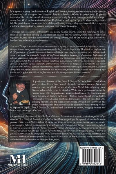 It is a poetic odyssey that harmonizes English and Spanish, inviting readers to traverse the tapestry of emotions and thoughts that transcend linguistic borders. Within its pages, over 50 poems intertwine like celestial constellations-each stanza a bridge between languages, each line a whisper across time. With its dawn-kissed syllables, English dances alongside Spanish, whose twilight tones fall like petals from a cosmic rose. It is a bilingual journey transcending mere accessibility; it weaves a cultural dialogue, inviting readers to explore their shared humanity. Temporal Echoes captures introspective moments, wonder, and the quest for meaning. Its verses resonate like stardust, inviting us to ponder our place in the vast cosmos, where time threads us all together. So, step into this poetic vessel, sail through verses, and let the echoes guide you-across borders, beyond words, toward eternity. Ecos en el Tiempo: Una odisea poética que armoniza el inglés y el español, invitando a los lectores a recorrer el tapiz de emociones y pensamientos que trascienden las fronteras lingüísticas. Dentro de sus páginas, más de 50 poemas se entrelazan como constelaciones celestiales: cada estrofa es un puente entre idiomas, cada verso es un susurro a través del tiempo. El inglés, con sus sílabas besadas por el amanecer, baila junto al español, cuyos tonos crepusculares caen como pétalos de una rosa cósmica. Este viaje bilingüe trasciende la mera accesibilidad; teje un diálogo cultural, invitando a los lectores a explorar su humanidad compartida. Ecos en el Tiempo captura momentos introspectivos, asombro y la búsqueda de signi cado. Sus versos resuenan como polvo de estrellas, invitándonos a re¿ exionar sobre nuestro lugar en el vasto cosmos, donde el tiempo nos une a todos. Así que adéntrate en esta embarcación poética, navega a través de los versos y deja que los ecos te guíen: más allá de las fronteras, más allá de las palabras, hacia la eternidad.