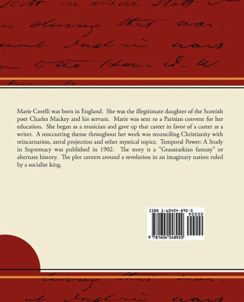 Marie Corelli was born in England. She was the illegitimate daughter of the Scottish poet Charles Mackey and his servant. Marie was sent to a Parisian convent for her education. She began as a musician and gave up that career in favor of a career as a writer. A reoccurring theme throughout her work was reconciling Christianity with reincarnation, astral projection and other mystical topics. Temporal Power: A Study in Supremacy was published in 1902. The story is a "Graustarkian fantasy" or alternate history. The plot centers around a revolution in an imaginary nation ruled by a socialist king.