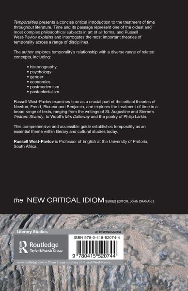 Temporalities presents a concise critical introduction to the treatment of time throughout literature. Russell West-Pavlov examines time as a crucial part of the critical theories of Newton, Freud, Ricoeur, Benjamin, and through related concepts, such as psychology, gender and postmodernism. The author also explores representations of time in a broad range of texts, ranging from the writings of St. Augustine and Sterne's Tristram Shandy, to Woolf's Mrs Dalloway and Stoppard's Rosencrantz and Guildenstern are Dead. This comprehensive and accessible guide establishes temporality as an essential theme within literary and cultural studies.